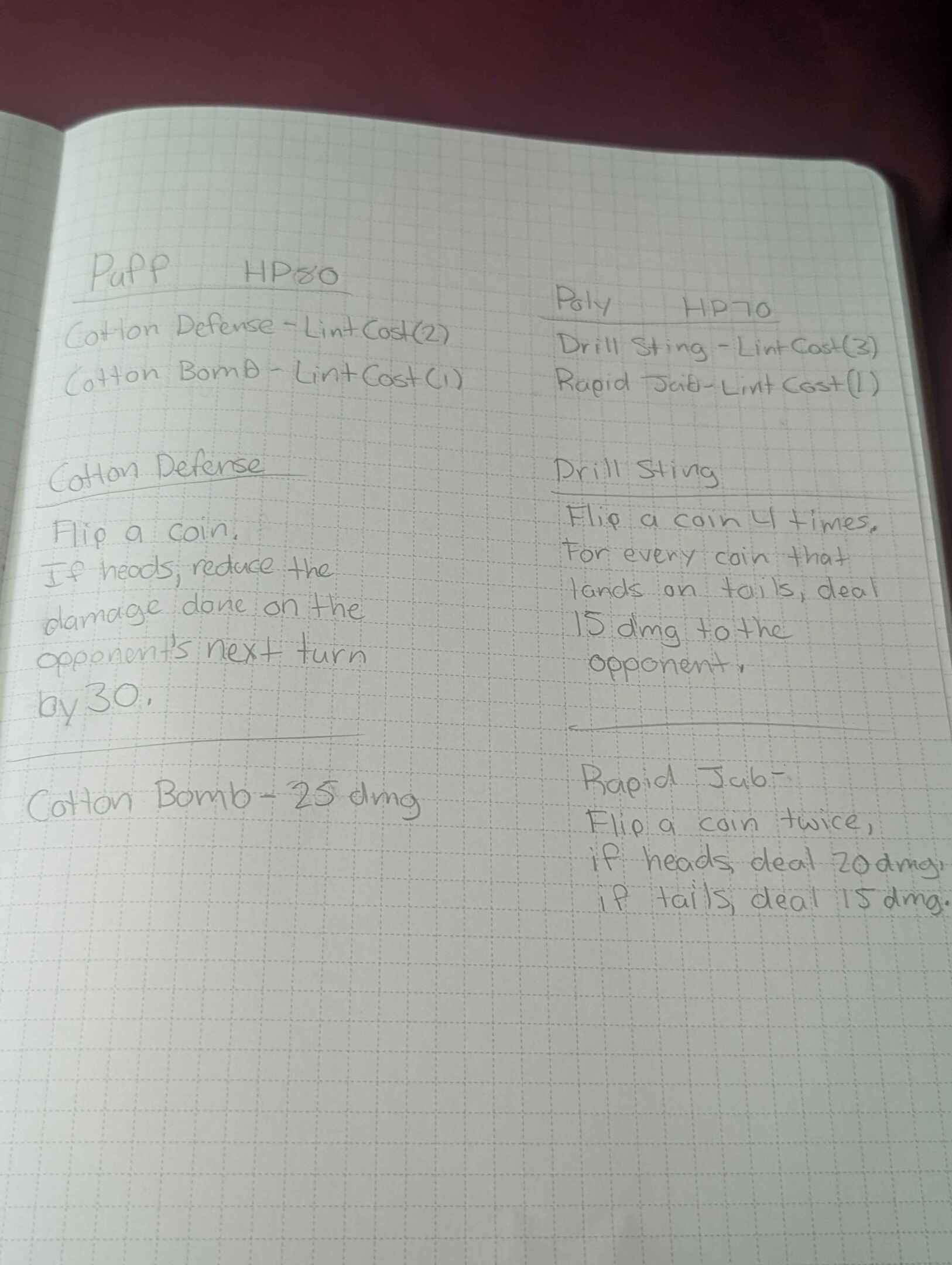 In addition to this, we had Sean design some basic HP values and abilities that are going to be used for the cards used within the game. Many of the ones used here are very thematic and will match with corresponding monsters.